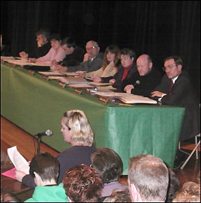 Perhaps the most popular item of concern was class sizes, both in the elementary and in the middle school. A group of 20 parents of next year's first graders stood together to urge the board not to cut the first grade to three sections next year, which would increase class sizes to 25-28 students. Lisa Hemmesch, one of two parents from the group who spoke on behalf of keeping four first grade sections, asked the board to visit a first grade classroom before increasing these class sizes. A number of speakers emphasized that low class sizes are just as important in the middle school. Under the proposed cuts, both the sixth and seventh grades could be reduced to three sections, increasing the classes to a projected average of 31 students, which would be the highest in the district. Middle school teacher Kathy Olmscheid explained the benefits of the middle school experience for students, with its emphasis on the social development of the students as well as academics. "Please keep in mind that teenagers are very, very vulnerable, too, and they need small class sizes, too," she told the board. Other speakers listed the benefits of extracurricular activities, especially jazz and marching band, pops choir, cheerleading, and danceline. High school student Sami Tierney spoke so impressively on the benefits of extracurricular activities, which she said would be more memorable for her than things she learned in class, that Bugbee said she had convinced him of the necessity of keeping the speech team. Some people complained that the cuts were too narrow. In many cases, the argument went, cuts would eliminate entire programs instead of sharing the reduction with other areas. Cheerleading and danceline, which could be eliminated at the high school, were examples of this arguement. The elimination of a corresponding sport for boys, it was pointed out, was not proposed. The lack of administration cuts was another area of concern for several speakers, who stressed that they didn't want to target administration, but felt it should offer savings to the school budget, too. The reduction of an entire principal might not be desirable, some said, but some sacrifice should be available. Another frequent concern was the cuts in music, mostly the extracurricular jazz and marching bands, and the possible reduction of a music teacher, which would allow less time for individual music lessons, which teachers and students stressed were very beneficial. Charon Tierney said the list of potential cuts was very traditional and that she was concerned that it targeted girls, arts, and the elementary school. She thought the idea of fund raising, though, was not traditional at all. What will come of it may be better known after the next school board meeting on Tuesday, Feb. 12. After that, the school board members will rank the potential cuts, in order to have a composite ranking ready for the board meeting on Tuesday, Feb. 26, when the cuts for the 2002-03 budget will be finalized. (Editor's note: The Press will have more information about the public hearing and school budget cuts in next week's edition. The public hearing was videotaped and will be broadcast on local cable in the next week on Channel 8. Broadcast times were not available when this issue went to press.)