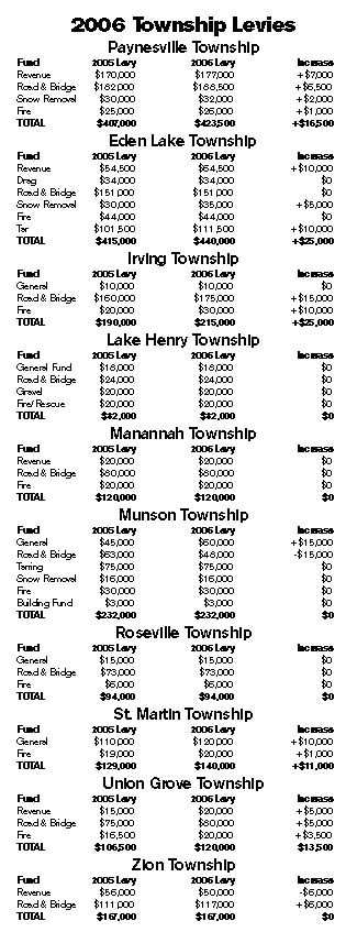2006 Township Levies Of the ten townships in the Paynesville area - see chart at right - five increased their tax levies for 2006. Two others reallocated their levy - raising part, while lowering another part the same amount - and three kept their levies the same in 2006 as 2005. Townships raising their levies for 2006 were: Eden Lake (up $25,000 to $440,000); Irving (up $25,000 to $215,000); Paynesville (up $16,500 to $423,500); Union Grove (up $13,500 to $120,000); and St. Martin (up $11,000 to $140,000). Eden Lake Township raised its levy to $440,000 by increasing its amounts for revenue by $10,000, for tarring by $10,000, and for snow removal by $5,000. This amounts to a six-percent increase in the levy. The residents of Eden Lake Township also gave their board of supervisors the go ahead to look at bonding to tar roads in the township. Research into costs and which roads to tar are expected this spring, after which the board will hold a public hearing. The roads would be tarred this summer. Irving Township raised its levy to $215,000 by increasing its road and bridge figure by $15,000 and its fire levy by $10,000. This $25,000 increase represents a 13-percent increase in its levy. Paynesville Township raised its revenue levy by $7,000, its road and bridge levy by $6,500, its snow removal levy by $2,000, and its fire levy by $1,000, totalling $16,500. Increasing its levy to $423,500 represents a four-percent levy increase. Union Grove Township increased its revenue levy by $5,000, its road and bridge levy by $5,000, and its fire levy by $3,500, totalling $13,500. Raising its levy to $120,000 for 2006, this is a 12.5-percent increase. St. Martin Township raised its general levy by $10,000 and its fire levy by $1,000, increasing its total levy to $140,000, or 8.5 percent. Munson Township and Zion Township changed allocations in their levies but kept their total levies the same for 2006: $232,000 for Munson and $167,000 for Zion. Zion Township also approved small contributions to both the Paynesville Area Center and the Paynesville Area Historical Society for 2006. Lake Henry Township ($82,000), Manannah Township ($120,000), and Roseville Township ($94,000) kept their levies the same for 2006. Township residents will pay for these tax increases in 2006, with the township governments receiving the money in 2007.