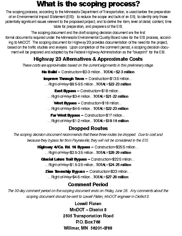After nearly two years of study, the first decisions about the future route of Highway 23 were presented to the public in Paynesville last week. The open house at the school attracted 135 residents, and more than 100 stayed for the public hearing in the auditorium on Wednesday, June 4.The Minnesota Department of Transportation and its consulting engineers, Edwards and Kelcey, presented the scoping document for their Highway 23 study. (The scoping process.) This document includes traffic studies and analysis and preliminary examinations of the potential routes based on engineering, environmental, and social factors. The main conclusion of the scoping document is to drop three bypass routes that go north of Paynesville from consideration in the lengthier Environmental Impact Statement (EIS), which is the next step in the study process. Paynesville residents Jeff Ampe (left) and Charles Ampe (hidden at far left) look at a map for a proposed future route of Highway 23 along with a consulting engineer. These three routes Ð the bypass following the Glacial Ridge Trail from Hawick to Roscoe, the bypass using Highway 4 and Co. Rd. 16, and the bypass through the west of town and then along the trail Ð have been effectively off the table for many months but are formally dropped in the scoping decision document, which will be filed with the Federal Highway Administration and will be used as a blueprint for the EIS, according to MnDOT. The scoping document recommends studying only those alternatives that make sense, said Tom Parker, an engineer with Edwards and Kelcey at the meeting last week. "We're in the process of narrowing things down,"Êhe said. If the scoping decision document is approved as issued, five alternatives for Highway 23 will be studied in the Environmental Impact Statement: no build, improve the existing alignment through town, and three bypass routes (east, far west, and west). The scoping decision document also eliminated some sub-options for these routes. For instance, the east and west bypasses presently are planned to run in the agricultural fields from the Kandiyohi County line into town, instead of following the current route past the golf course. Also, the west bypass now goes between a row of businesses (Alco, the American Legion, etc.) and the airport and not right past the schools. And, for the west and far west bypasses, the present plan calls for them to follow Co. Rd. 33 back to Highway 23 instead of going straight across the farm fields to the east and joining with Highway 23 a couple miles out of town. Comments about the scoping document can be made until Friday, June 26, by writing to: Lowell Flaten, MnDOT District 8, 2505 Transporta-tion Road, P.O. Box 768, Willmar, MN 56201-7068. In an hour-long presentation at the public meeting, Parker recapped the study so far: how the traffic studies indicated a need for the project (because the projected levels of service on the existing road would be inadequate by 2025); how the traffic analysis indicated a need to keep the road close to Paynesville (because nearly half of weekday traffic either starts, ends, or makes a stop in Paynesville); and how that led to dropping the three longest bypasses that go far to the north of town because they would not serve Paynesville well. While reducing the number of routes and options lessens the amount of work required in the rest of the highway study, eliminated items can be added back into the study if it can be shown to be worthwhile, said Parker. So far, the Highway 23 study has taken preliminary looks at engineering, environmental, and social factors. In the Environmental Impact Statement, which is next, 27 factors will be studied: air quality impacts; bikeways and pedestrians; contaminated sites; construction impact; cumulative and secondary impacts; economic impacts; erosion control and slope stability; environmental justice; farmlands; fish and wildlife; floodplain; groundwater and geology; land use and joint development; park, recreational, open space, public-use lands, forest land, and trails; noise; right-of-way acquisition and relocation; social and neighborhood impacts and community facilities; soils and materials; streams; traffic and transportation impacts; utility locations; visual impacts; water quality; wetlands; earthborne vibration; endangered and threatened species; excess materials; handicapped access; irreversible use of resources; local short-term use versus long term; transit impacts; vegetation; wild and scenic rivers; cultural resources; historical resources; and archaelogical resources. At the end of the Environmental Impact Statement, based on these study criteria, a preferred alternative will be selected, said Parker. If the study is complete and thorough, this should be the future route of Highway 23, he added. Parker said the Environmental Impact Statement is not expected to be completed until the winter of 2004 at least. When the Highway 23 study started nearly two years ago, the final Environmental Impact Study was expected to be done by the winter of 2003. More public hearings will be held for the draft Environmental Impact Statement and for the final Environmental Impact Statement. Until then, a local task force will be meeting with the engineers on a semi-regular basis. Anyone wanting to convey an idea or opinion to the engineers can contact a task force member. They are: John Janotta, high school principal; Don Otte, Stearns County Commissioner; Jeff Thompson, mayor of Paynesville; Dave Peschong, city council member in Paynesville; Don Pietsch, supervisor for Paynesville Township; Paul Evans, Paynesville Area Chamber of Commerce; Peter Jacobson, president of the Koronis Lake Association; Ed Gottwald, resident-at-large (township); Joe Kremer, resident-at-large (city); Jeff Bertram, resident-at-large (city); Steve Helget, city administrator for Paynesville; and Mike Flanders, Roseville Township. Parker and Flaten also spent an hour answering quest