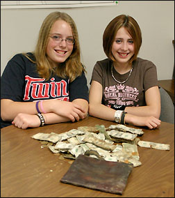 Just after school started last fall, Stephanie Lucas and Whitney Woehler, then seventh graders at PAMS, headed to the Crow River Nature Park in Paynesville to try and find some crayfish as extra credit for science class. While probing the river, they found a bank bag under a rock. "We didn't know what it was," said Woehler. "We just tried to open it."
