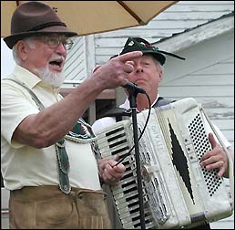 Ray Lindeman, festival emcee in his German outfit, sang along with the accordion player, Allan Schultz, during the festival. Friendliness needs to start with every individual, Colbert said. "You reach out your hand halfways - sometimes more than halfways - and people will reach out to you, but you have to be open," he said. A total tally on attendance at the festival proved elusive due to the come-and-go nature of the crowd. Throughout the five-hour festival, approximately 150 people were on the grounds and in the museum (which offered discounted admission of $1). Voss estimated the total attendance was at least 350 people. More people would have stayed longer if the weather would have been warmer, speculated Voss. Emcees for the program were Dr. Ray Lindeman and Lynne Jacobson.