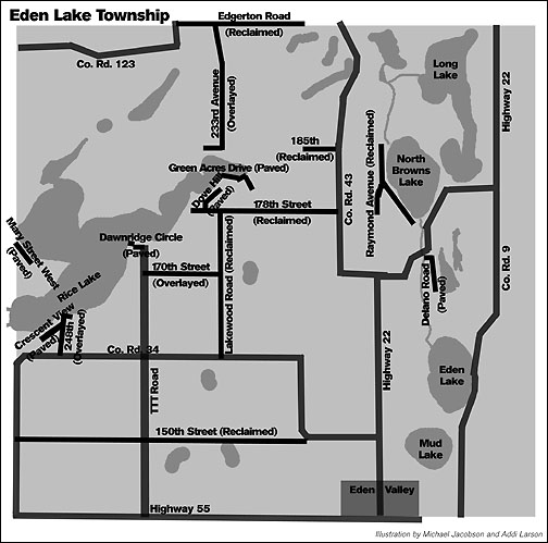 Eden Lake Township completed a $968,000 road project this summer, paving or repaving nearly 14 miles of roads in the township. "We really watch the money. Everybody that's on the township board lives in the township. You've got to keep it up," said Eden Lake Township supervisor Dave Benkowski. Last March, Eden Lake Township residents approved raising their levy to $440,000 this year. With a 15-year bond for this summer's road project, the township has roughly $75,000 per year committed to these bond payments. "Well over 50 percent" of residents voted in favor of the decision to tar roads along southern Rice Lake, said Benkowski. In the past, residents in the area had made requests to tar roads that were covered with crushed rock. Benkowski found, in speaking with a couple on Green Acres Drive, that residents dependent upon walkers were feeling alienated by the un-paved roads. Now, said Benkowski, paved roads have enabled residents to be more mobile. One woman remarked on the difference in simply being able to leave the house and take a walk. On Raymond Avenue along Browns Lake, kids have been rollerblading over the newly-paved roads in their neighborhood, also previously covered with crushed rock, said Benkowski. The TTT Road was not paved this year (from Co. Rd. 34 to Highway 55). Benowski said residents might conclude that since the road connects residents on southern Rice Lake with Highway 55, it would have been reasonable to repave. The reason the TTT Road was not paved this year - yet is planned to be paved in the future - is because the majority of roadwork (63,345 feet) was done to repair and reclaim existing roads and prevent further damage. "The township board kind of wanted to take care of (TTT Road), but I felt it was more useful to reclaim a lot more roads. In the future, I'm hoping we can tar that," Benkowski said. Lakewood Road, which runs between Co. Rd. 34 and Highway 55, is not currently in future plans for tarring due to traffic of heavy machinery by farmers and by those using a gravel pit on the road. The decision to reclaim existing paved roads was economical, said Benkowski, since the materials (i.e. asphalt) have already been paid for. Also, the maintenance interval is extended, as the roads are more adequate for winter protection and cracking will be largely reduced. Benkowski said that major maintenance would have otherwise been required on these roads in approximately five years. The roads are now projected to last approximately 20 years, said Benkowski. Township chairman Jonathan Schaumann and supervisor Ralph Hennen also worked directly with Bauerly Companies this summer and oversaw the road projects. Eden Lake Township also paid for half of the upgrades of Cyrilla Beach Road, located in Paynesville Township but serving solely Eden Lake Township residents, this summer.