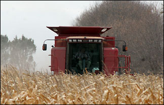 Nearly a third of the soybean crop in the state was harvested from Sunday, Oct. 8, to Sunday, Oct. 15. Curt Wegner combined corn in a field east of Paynesville on Monday, Oct. 23. According to state statistics, nearly a quarter of the corn crop was harvested last week, with more than half of the corn crop now harvested. Wegner, who helps his son Tim with field work said they have a few fields of corn left to combine and a few second-growth beans and should finish this week. Nearly a quarter of the corn crop was harvested last week, increasing the percentage of corn harvested from 28 percent to 52 percent. Both the corn and soybean harvests are ahead of last year's pace and ahead of the five-year average. Curt Wegner, who helps his son Tim farm a couple thousand acres of land around Paynesville, said they should be done harvesting this week. They have a few fields of corn to harvest and some beans that grew again after the late rains. Yields have been "spotty," said Wegner, depending heavily on the soil type and subsoil moisture. Despite the long dry spells this summer, the NASS is reporting better than expected yields in the state. The October 1 corn yield for the state was forecasted at 166.0 bushels per acre by NASS, up two bushels per acre from September. This is down slightly from last year's record yield of 174.0 bushels per acre. The state corn crop, though, is now forecasted at 1.13 billion bushels, up 63.1 million bushels from last year. The state soybean crop is now forecasted at 304.5 million bushels, up 16.5 million bushels from the September forecast and down 1.5 million bushels from last year. For the United States, the corn crop is now forecasted at 10.9 billion bushels, which, if realized, would be the second largest on record (behind 2004). The soybean crop is forecasted at 3.19 billion bushels, which, if realized, would be the largest yield on record.
