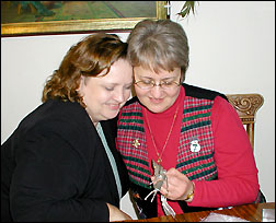 Halvorson thought Lynda, who lives in Paynesville and runs a daycare, deserved the award because she doesn't wear her faith loudly but because it radiates from her. She is a tremendous influence on the people around her, even though she doesn't force it on them, said Halvorson. Lynda George (right) receives a birthday angel from her friend, Carol Halvorson. Because Lynda is her "Faith Angel," Halvorson nominated Lynda for the "Spirit of a Champion" Award from Spirit 93 radio. Halvorson thought for a long time that Lynda deserved the award, but nominated her last month because she thought the Christmas season was the right time. Halvorson's nomination read: "Lynda is a peaceful, caring person, and whenever friends are about, they say they always feel love." Lynda believes that faith is the most important thing in her life. She grew up in church and her faith was instilled in her for life, she said. "Faith, family, friends. That's the way I want to live my life," she explained. Halvorson thinks "Faith, Family, and Friends" should be carved on Lynda's tombstone because that is the way she has lived her life. Lynda and her late husband, Scott, relied heavily on their faith when he was diagnosed with multiple sclerosis in the early 1980s and again during the last couple of years when Scott was fighting cancer. When Scott died in March, Lynda needed her faith more than ever, she said. Even though she was in tremendous pain, Lynda was still able to reach out to others, said Halvorson. In fact, how Lynda kept her faith during Scott's illness is just one of the reasons Halvorson nominated her friend. "Lynda has an amazing ability to care for others, even when she's going through a difficult time herself," wrote Halvorson in her nomination. According to Halvorson, Lynda is an inspiration to everyone around her, even the children in her daycare. She doesn't nag; she doesn't push; she just exudes faith and love. "She nudges people in the right direction, and they don't even realize it's happening," laughed Halvorson. Lynda is a faith angel to many people who don't even realize it, added Halvorson. Lynda will receive an award certificate, and her name has been mentioned on Spirit 93 radio. Normally, Spirit of a Champion winners are featured on the station for a week, but Lynda has been featured for about three weeks now. Halvorson believes Scott is the reason for this. "Scott is up there saying more people ought to hear about this," she laughed.