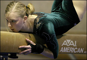 Junior Kate Nelson focuses on the beam during her routine last week. Melrose had their biggest scoring differentials on the uneven bars and balance beam, beating Paynesville on bars by nearly nine points and on beam by nearly ten points. "We need to work harder on getting our bars and beam scores higher," said Nehowig. Only Kacy Nehowig placed for the Bulldogs on individual events, taking third on bars and fifth on the vault and floor. She also was fifth in the all-around competition, despite coming within one point of the school record in the all around. Nehowig scored 33.15 in the all around; the record is 34.15, set by Sara Spanier in 1995. Kotten placed fifth in the all around, coming within a half point of scoring 30 points, which is coach Nehowig's goal for her this season.