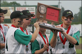 The disappointment shows as junior Steve Gerding, senior Mitch Mueller, senior John Hemingson, and senior Mark Andrie lift the second-place trophy for the Bulldogs on Friday. That gave St. Anthony a 13-1 lead, and they proceeded to win their first state title in baseball in their second ever state appearance. "They played very well. They deserved to win," said Skoglund. But, he added, it was disappointing for the Dogs to end their season without playing well, to lose when not playing close to their ability. "Obviously, we didn't play our best today, but it wasn't for a lack of effort or trying," said Skoglund at the welcome home on Friday night. "We didn't really play like champions," said Hemingson. "They played like champions." "You want to go out with a fight, and we didn't really fight," added Hemingson. Baseball, Skoglund always stresses, is a game of momentum. The 5-0 hole against St. Anthony Village gave the Huskies the momentum from the start. Senior James Paul, who did not play on Thursday after hurting his knee and spraining his ankle while wakeboarding on Lake Koronis on Tuesday, started pitching in the state final (for the second year in a row) against St. Anthony. James wanted to play on Thursday and wanted to pitch on Friday, said Skoglund. He had medical clearance and threw very well in the bullpen, so the coaches decided to give him a chance. He walked the first three batters he faced with a strict strike zone, despite coming close with his pitches, and hit the fourth batter with the bases loaded, scoring the first St. Anthony run, prompting a pitching change. Another hit batter, a Bulldog error, and a single up the middle gave St. Anthony a 5-0 lead in the first frame. In the second, St. Anthony scored a run on two infield hits - one that hit a footprint in foul territory and rolled back onto the chalk - and a walk.