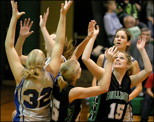 Junior Lynn Lieser and senior Sam Moser battle two taller BBE players for a rebound in Friday's game. Lieser led the Dogs with 12 rebounds. "We dug ourselves a big hole that was too big to get out of," said coach Jackie Parsley, who was pleased with the Dogs' second-half effort and remains optimistic about their season. "We definitely have thing to work on," she said, "but they are fixable problems. We still have a good team." The Bulldogs scored half their points on free throws against BBE. They made only nine field goals in 73 attempts, shooting 12 percent, and made one three-pointer, by junior Ashley Lieser, for 19 points. They made 19 free throws (in 34 attempts) for the other half of their points, shooting 56 percent from the charity stripe. Senior guard Kim Hess led the Dogs with 10 points, followed by Lieser with nine and senior guard Kendra Johnson with eight. Next week, after Thanksgiving, the Dogs will play on Tuesday, Nov. 30, at Kimball and they will play their first West Central Conference North game at Sauk Centre on Friday, Dec. 3.